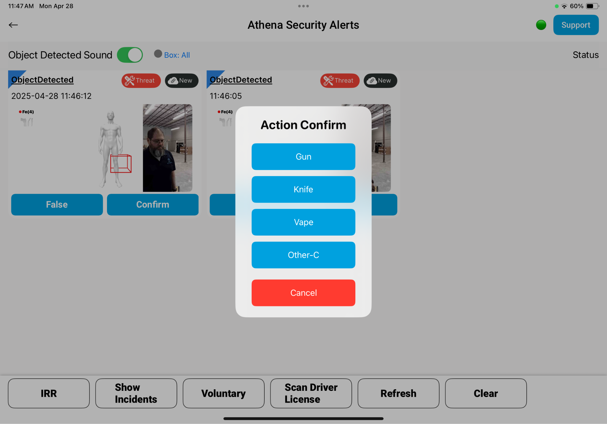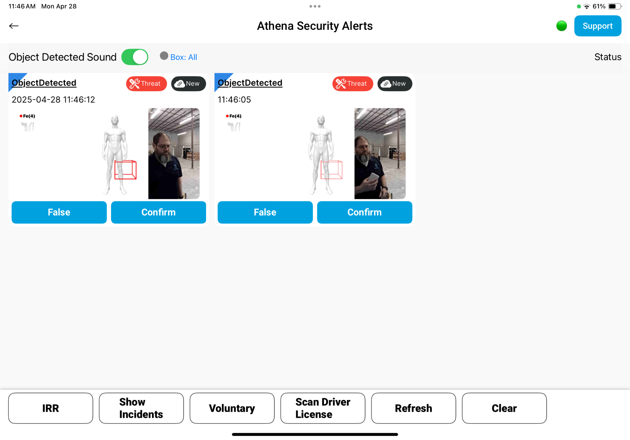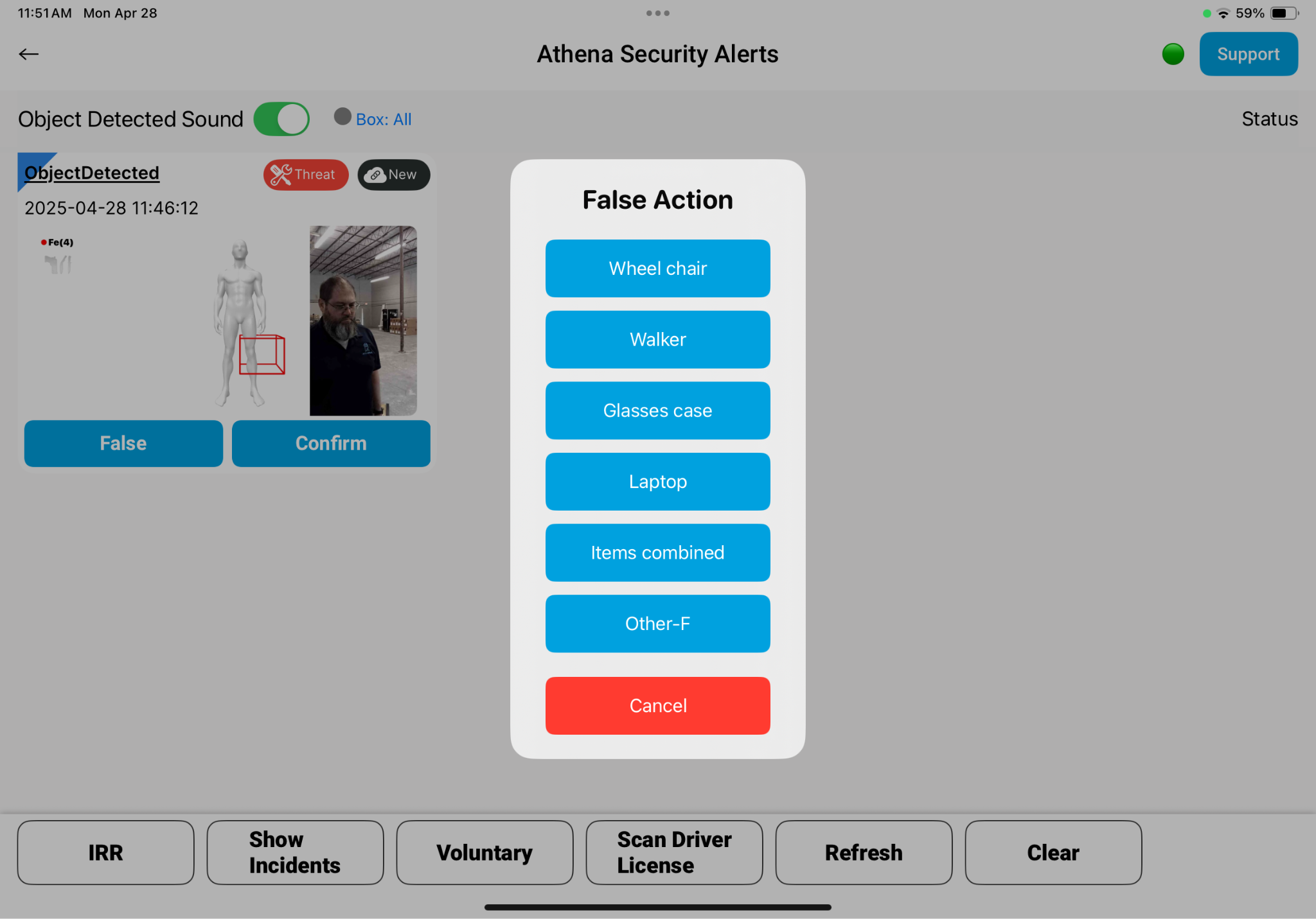 If secondary inspection identifies the alert as a False Alarm, the officer can click on the False button under the alert on the main screen, where they are prompted to select the type of object triggered the alert. Once an alert is either Confirmed or marked as False, the alert is removed from the screen.