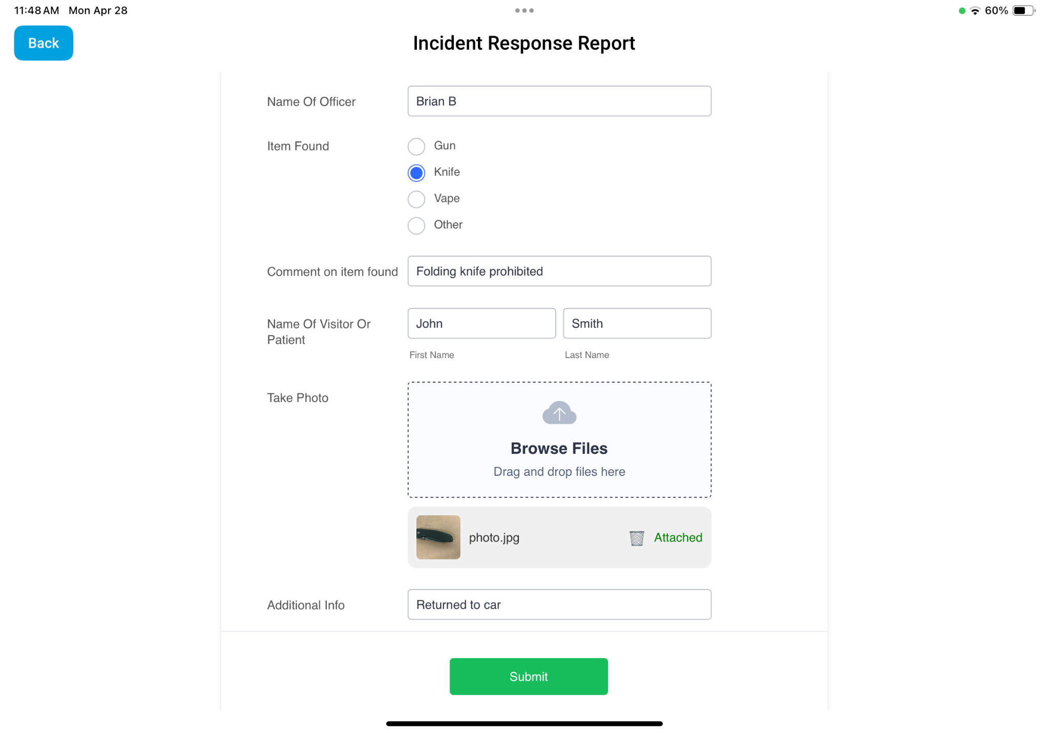 An IRR form is loaded whenever the officer either Confirms an Alert or they click the IRR Button on the main screen. The purpose of the IRR is to conform with compliance standards by documenting the nature of an incident.