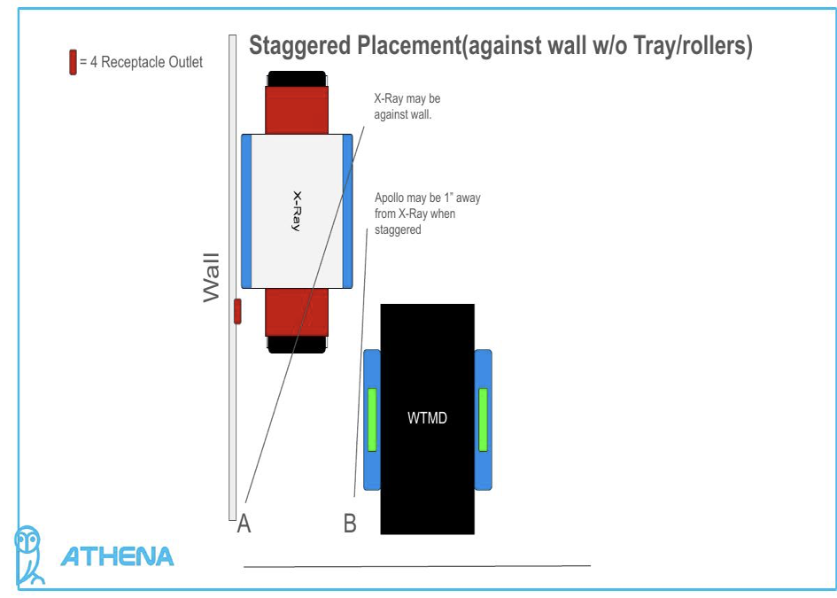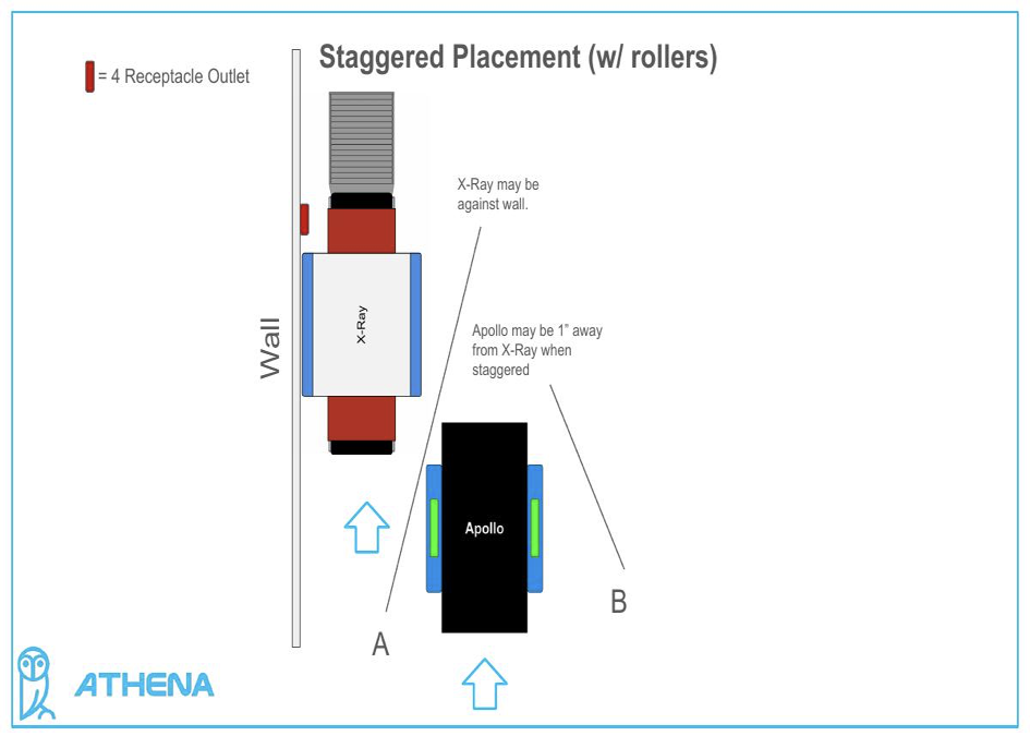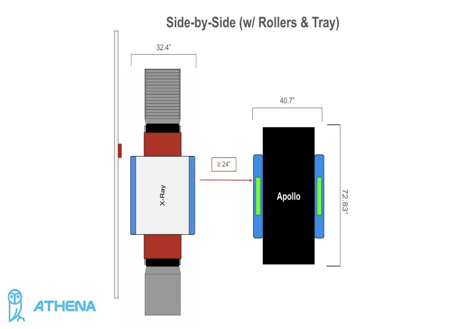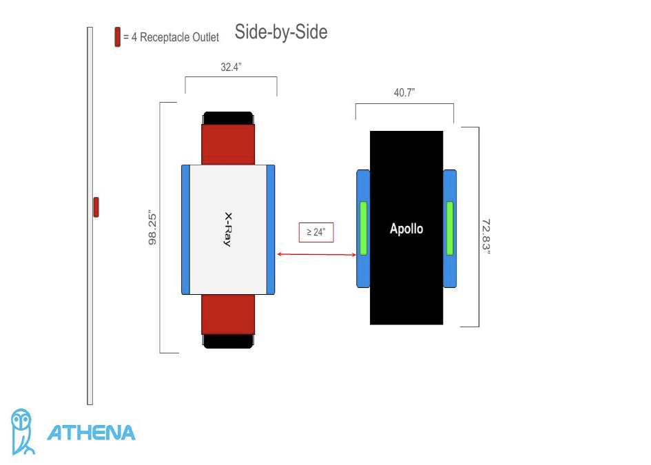 This article outlines the minimum space requirements and approved placement configurations for deploying the Athena X-Ray and Apollo units together. Follow these guidelines to ensure proper functionality, safe operation, and adequate power access.