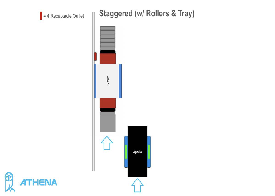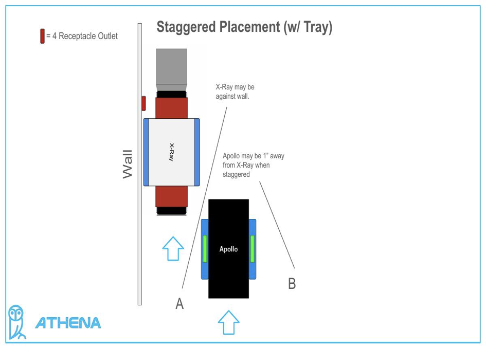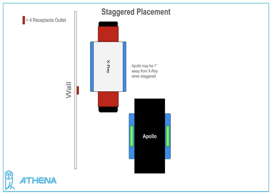 In a staggered configuration, the Apollo is offset from the X-Ray (not directly beside it). This layout allows the Apollo to be positioned as close as 1 inch from the X-Ray, making it ideal for tighter spaces.
